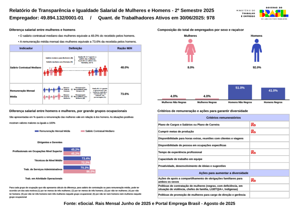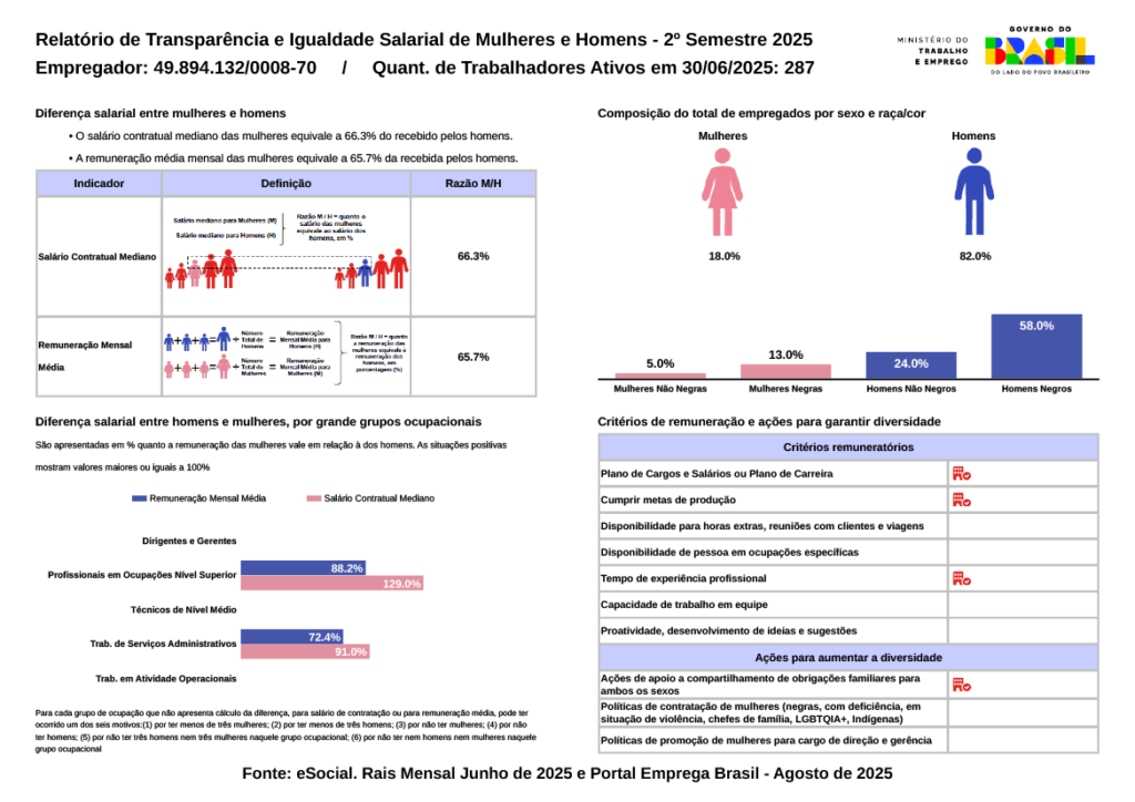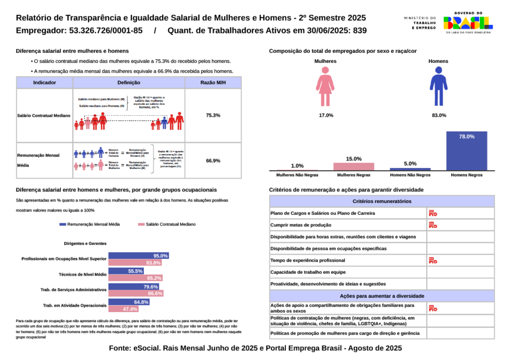 Em cumprimento à Lei 14.611/23, a AGT faz a publicação semestral de relatório de transparência salarial e de critérios remuneratórios por pessoas jurídicas de direito privado, conforme os dados emitidos pelo Ministério do Trabalho e Emprego, reservando-se a empresa a apresentar aos órgãos competentes eventuais inconsistências na extração dos dados.